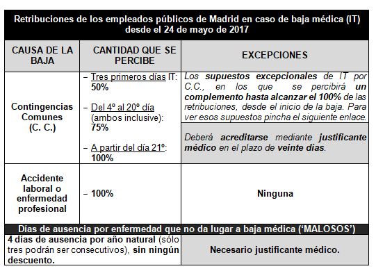- En el BOCM de 23 de mayo de 2017 se publicó el Acuerdo de la Mesa General de Negociación de la Comunidad de Madrid de 19 de abril, con el objetivo de mejorar hasta el 100% el complemento salarial de las retribuciones que recibimos los empleados públicos de la Comunidad de Madrid (funcionarios, laborales o estatutarios) en situación de baja laboral por enfermedades o accidentes no relacionados con el trabajo (I.T. por Contingencias Comunes).