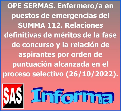 OPE SERMAS. Enfermero/a en puestos de emergencias del SUMMA 112. Relaciones definitivas de méritos de la fase de concurso y la relación de aspirantes por orden de puntuación alcanzada en el proceso selectivo (26/10/2022).