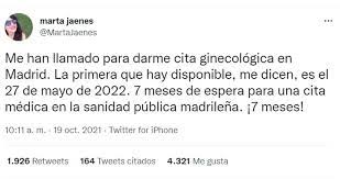 Una cita de ginecología no había dado tanto de qué hablar como la que ha recibido la periodista Marta Jaenes. Pero no por el hecho de la cita en sí, sino por la fecha que le han dado en la sanidad pública madrileña, y que es todo lo contrario a lo que dijo la presidenta madrileña Isabel Díaz Ayuso hace unos días en la Asamblea de la comunidad cuando alardeaba de su gestión y de tener la sanidad que “toda España desearía cuidar”.