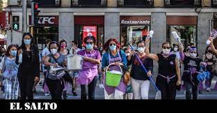 Desde esta organización aragonesa recuerdan que “además del racismo está el clasismo, porque aunque los empleadores no sean ricos, ellos saben que están en una posición mejor que nosotras, mujeres racializadas migrantes”. “Nosotras —comenta Elena Vidal Martín, trabajadora de ayuda a domicilio y secretaria general del sindicato OSAD— tenemos entre un 70 y un 80% de compañeras migrantes, la mayoría de Latinoamérica. Estas mujeres han tenido una situación laboral muy complicada y sin soporte familiar, por lo que te tienes que buscar la vida. Durante el covid algunas compañeras se tuvieron que unir para pedir un día libre sin retribuir cada semana para ocuparse de los hijos de todas e ir rotando”. “El 95% de las trabajadoras en limpieza son mujeres y son trabajos que se vinculan con el sostenimiento de la vida pero que están invisibilizados”, opina Olaia Bilbao, desde LAB, que considera que “el patriarcado se alía con el capitalismo porque les sale más barato precarizar el trabajo de las mujeres”.