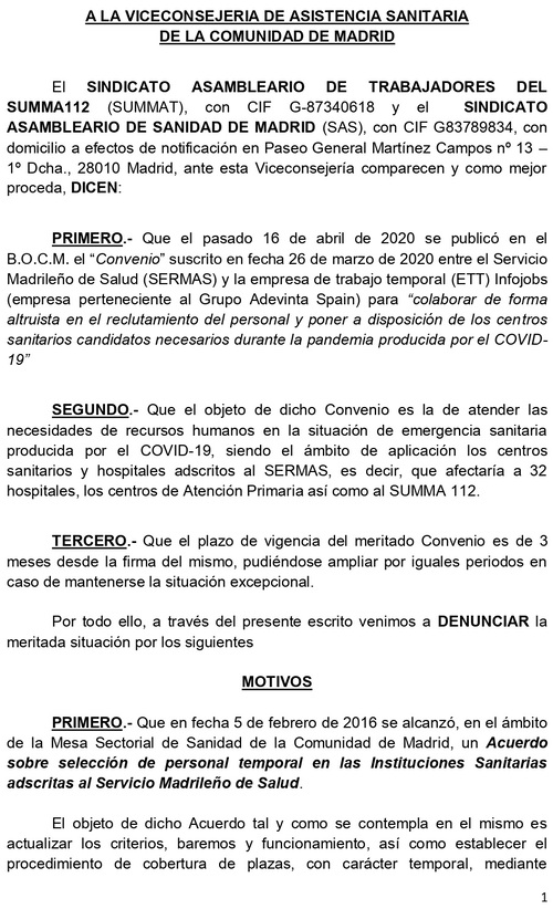 Por ese motivo, los sindicatos firmantes han presentado con fecha 27 de abril de 2020 denuncia de los hechos ante la Viceconsejería de Asistencia Sanitaria de la Comunidad de Madrid (Dirección General del Servicio Madrileño de Salud) solicitando que se deje sin efecto el Convenio suscrito entre el Convenio de 26 de marzo de 2020 entre la Comunidad de Madrid, a través del Servicio Madrileño de Salud e Infojobs; respetando el Acuerdo sobre selección de personal temporal en las Instituciones Sanitarias adscritas al Servicio Madrileño de Salud en base a los principios de igual, mérito, capacidad y publicidad.