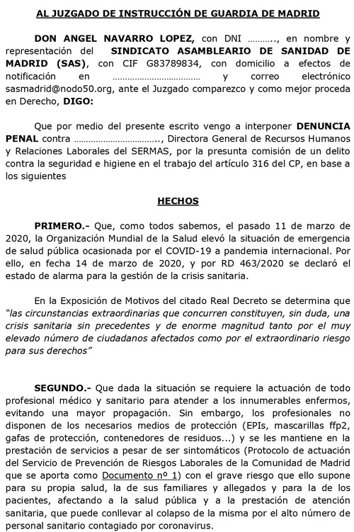 El 01 de abril de 2020, el Sindicato Asambleario de Sanidad de Madrid (SAS), ha presentado la siguiente demanda ante el Juzgado de Instrucción de Guardia de Madrid: