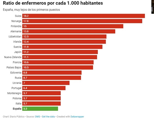 Además de falta de presupuesto, España sufre de forma acuciante la falta de personal de enfermería, una cuestión generalizada en todo el país. Si Suiza tiene 18,2 profesionales en plantilla por cada 1.000 habitantes, España tiene 5,3. Naciones como Uzbekistán, Eslovenia, Montenegro o Polonia también tienen una media superior.