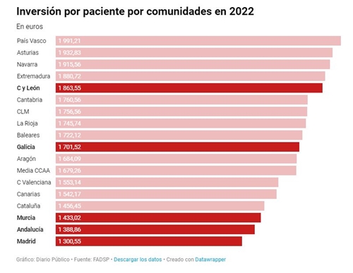 Madrid (1.300 euros), Andalucía (1.388 euros) y Murcia (1.433 euros) son las que menos invierten por paciente. Galicia (1.701) y Castilla y León (1.863) en cambio superan la media nacional, ubicada en 1.679 euros.